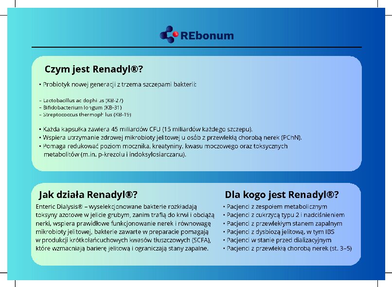 Renadyl® wykorzystuje mechanizm Enteric Dialysis® (Dializa Jelitowa). W chorobie nerek organizm gorzej radzi sobie z usuwaniem toksyn azotowych, takich jak mocznik czy kreatynina. Wyselekcjonowane bakterie w Renadylu® trafiają do jelita grubego, gdzie aktywnie rozkładają te toksyny, zanim zdążą w pełni wchłonąć się do krwi i obciążyć już osłabione nerki. Jest to dodatkowy, naturalny proces oczyszczania organizmu, który wspiera nerki.